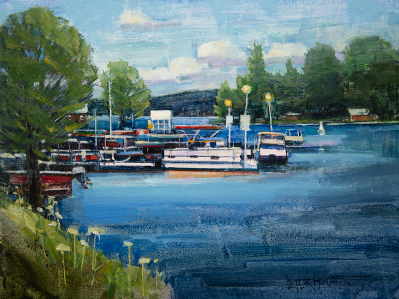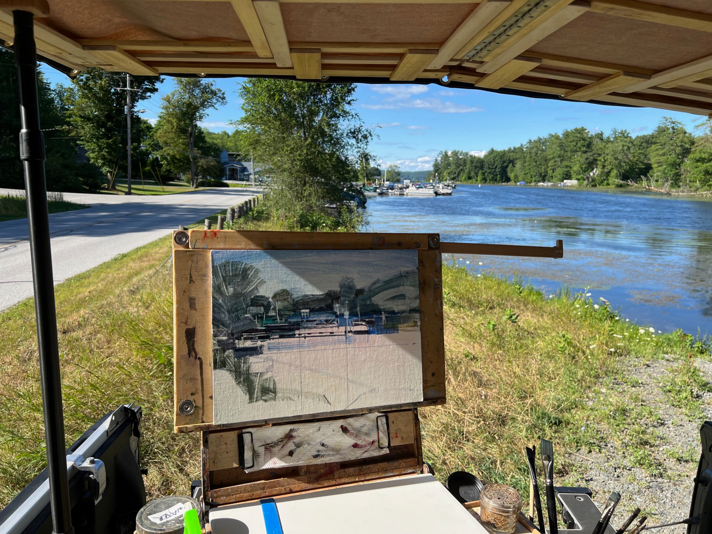Last week I was set up underneath the Route 4 overpass on Creek Road, along the west shore of Lake Bomoseen. The spontaneous choice was rewarded with a gorgeous summer view stretching up the channel and out to the lake. The boats docked at Woodard Marine were dancing like colorful jewels under the July sky. Conditions were nearly ideal, but when painting “en plein air,” there’s always something to contend with. That’s half the fun, though! A strong lake breeze was blowing, accompanied by occasional gusts. I darn near lost my shelter top. That’s expendable. The painting was never in jeopardy.